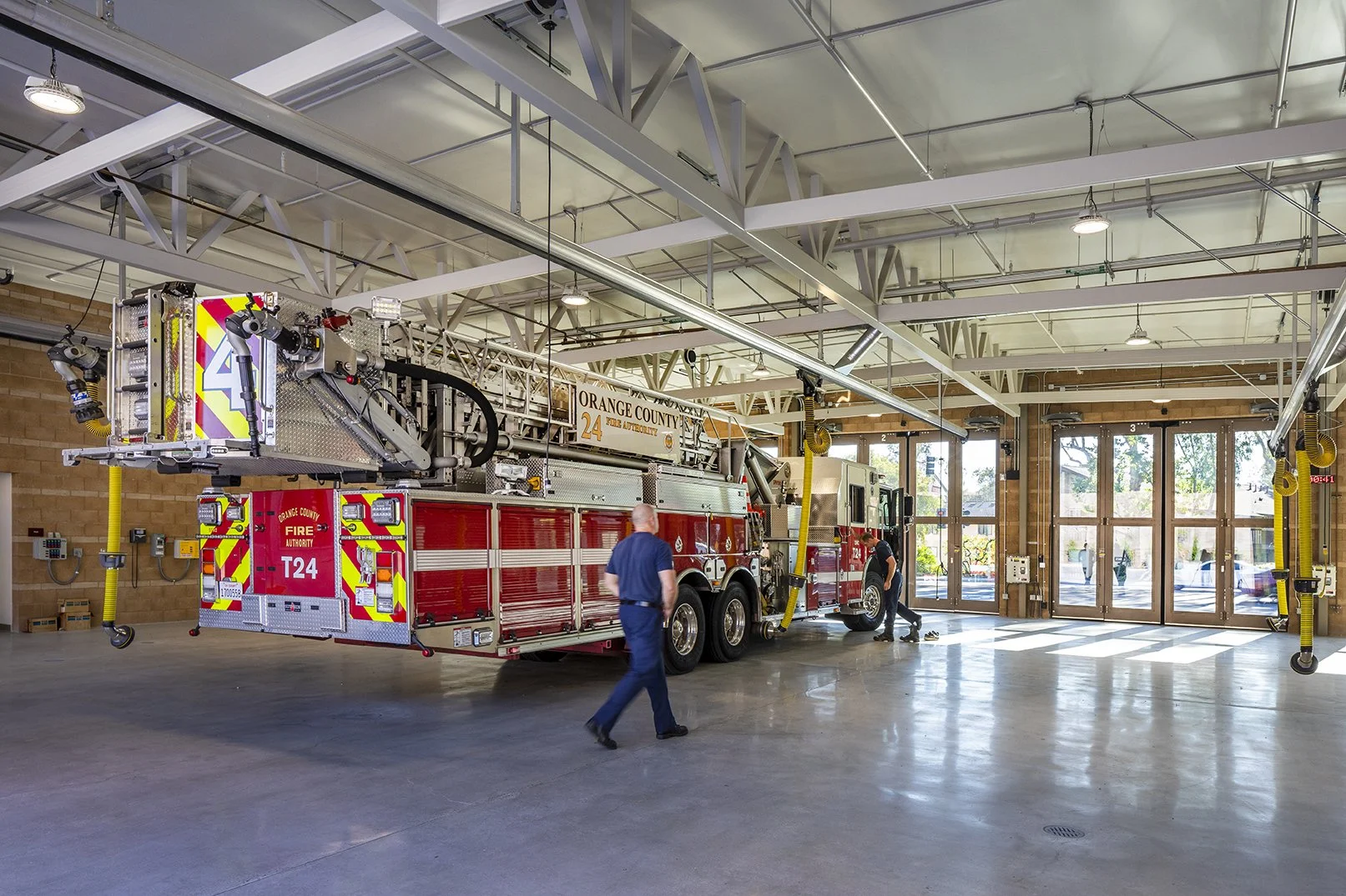 The new station includes four apparatus bays, capacity for an aerial platform truck, and dedicated areas for turnout gear, hose storage, decontamination, and medical supplies. It also features a kitchen and day room, offices, an exercise space, and a second-floor patio. With twelve bunk rooms and eight restrooms (triple the capacity of the original), Station 24 now meets the operational scale of modern fire service.